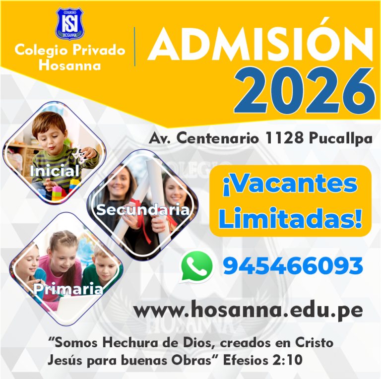 Los Padres de Familias, interesados en una vacante para el Colegio HOSANNA – Año Lectivo 2026, deberán inscribirse a través del Link de la plataforma SIANET ubicado en la parte inferior o visitar las instalaciones del colegio de forma presecial.: